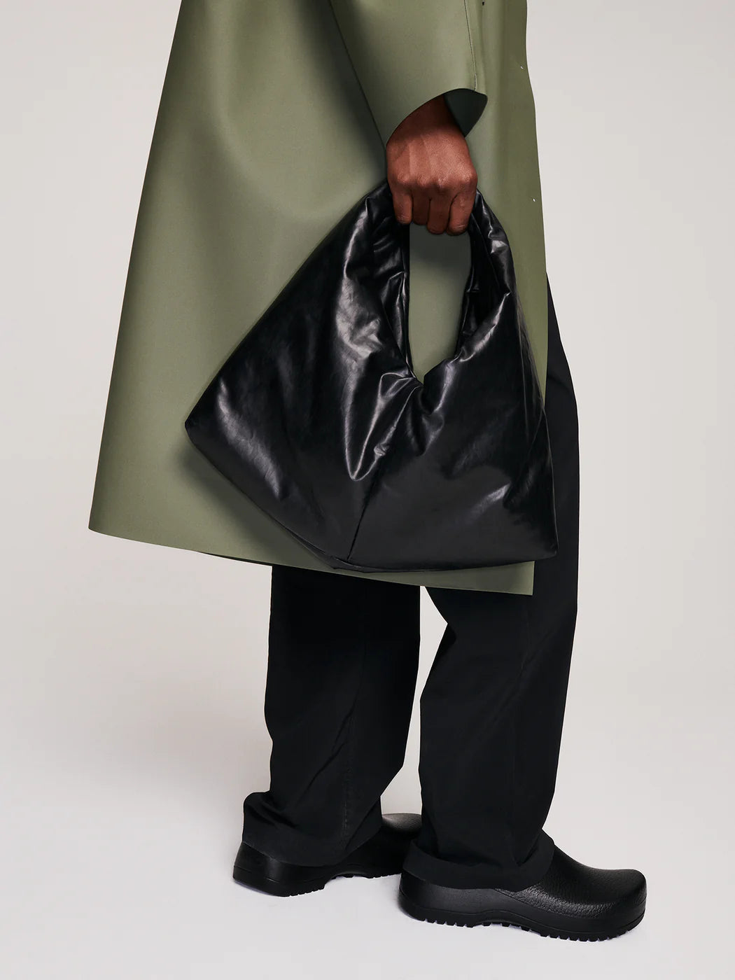 The Anchor small in oil black is crafted from the signature oil coated cotton-blend. A lightly padded handbag featuring an inner drawstring bag, keeping belongings secure as day turns to night. The small version can be worn comfortably in your hand or around your shoulder.