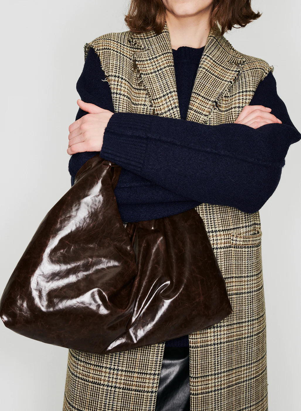 The Anchor small in skai dark brown is crafted from cotton fabric with a light shine and a stiff, water-repellent outer surface. A lightly padded handbag featuring an inner drawstring bag, keeping belongings secure as day turns to night. The small version can be worn comfortably in your hand or around your shoulder.