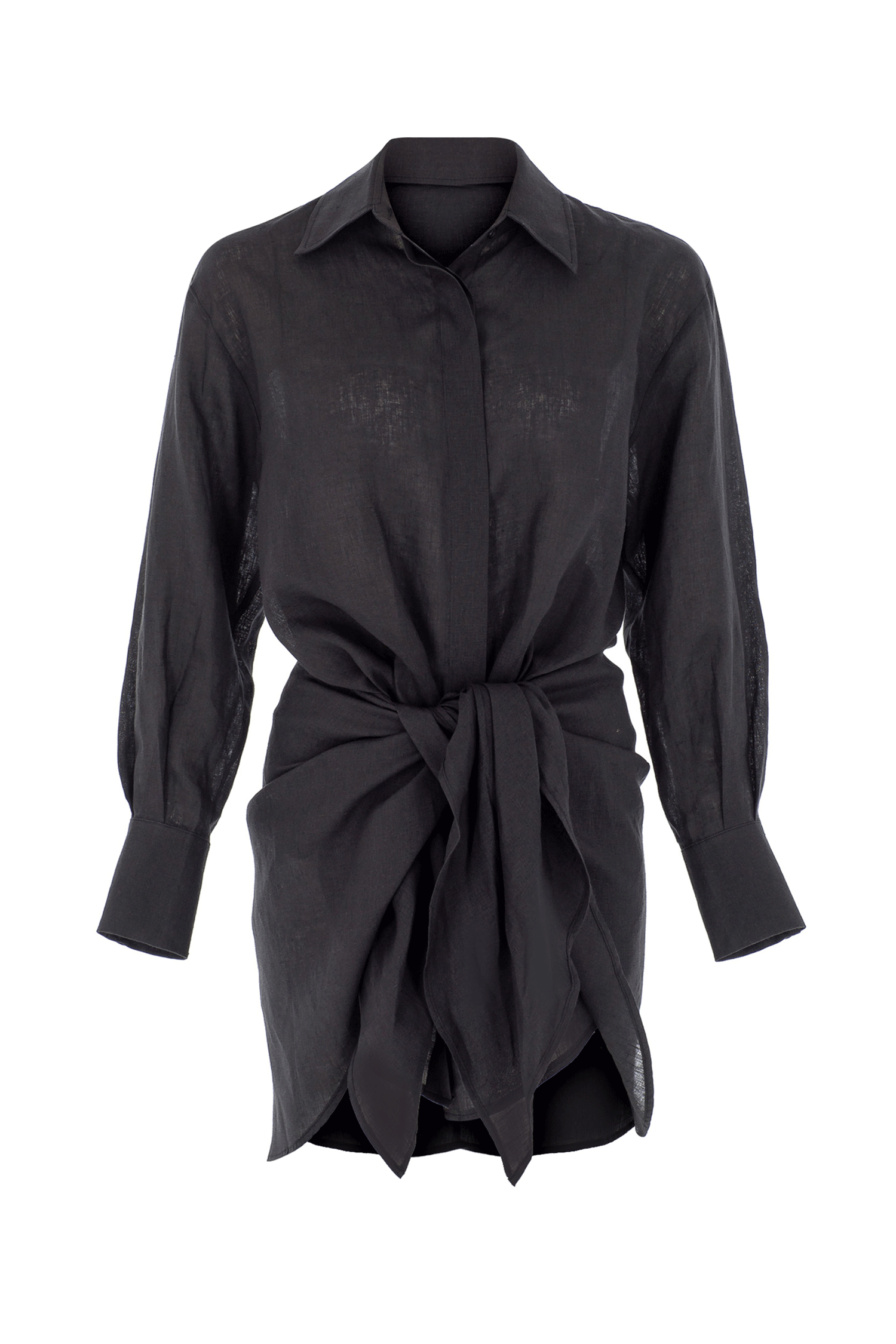Mini shirt dress with two color options, black and white. The fixed belt at the back is tied from the front and fits perfectly on the waist. There are gold colored buttons on the collar and cuffs.