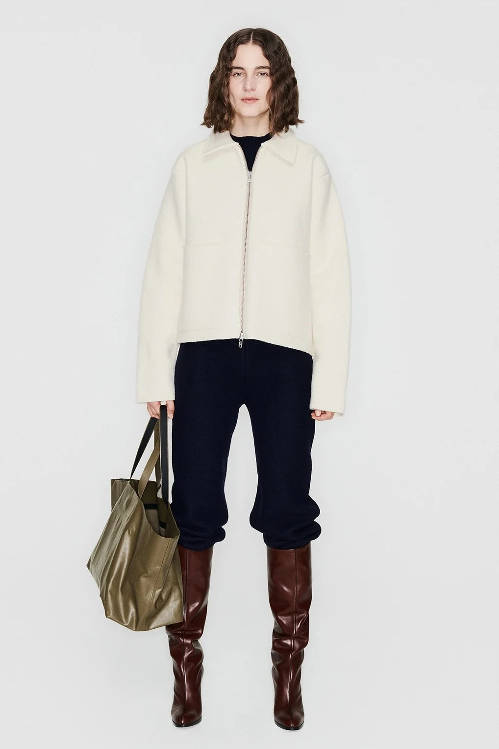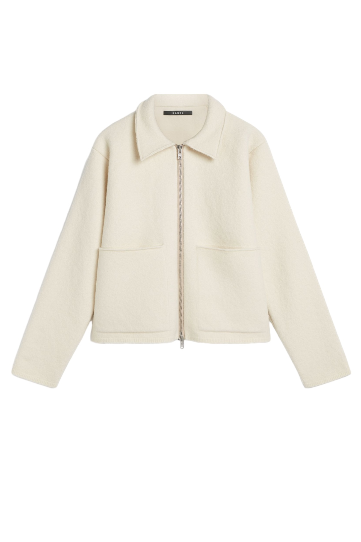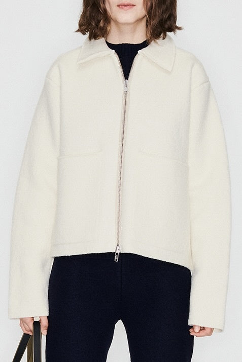 The Blouson jacket, in an elegant soft white color, is crafted from 100% virgin boiled wool, creating a luxurious and substantial felted texture. The jacket's relaxed fit and spread collar make it stylish and versatile for any occasion.