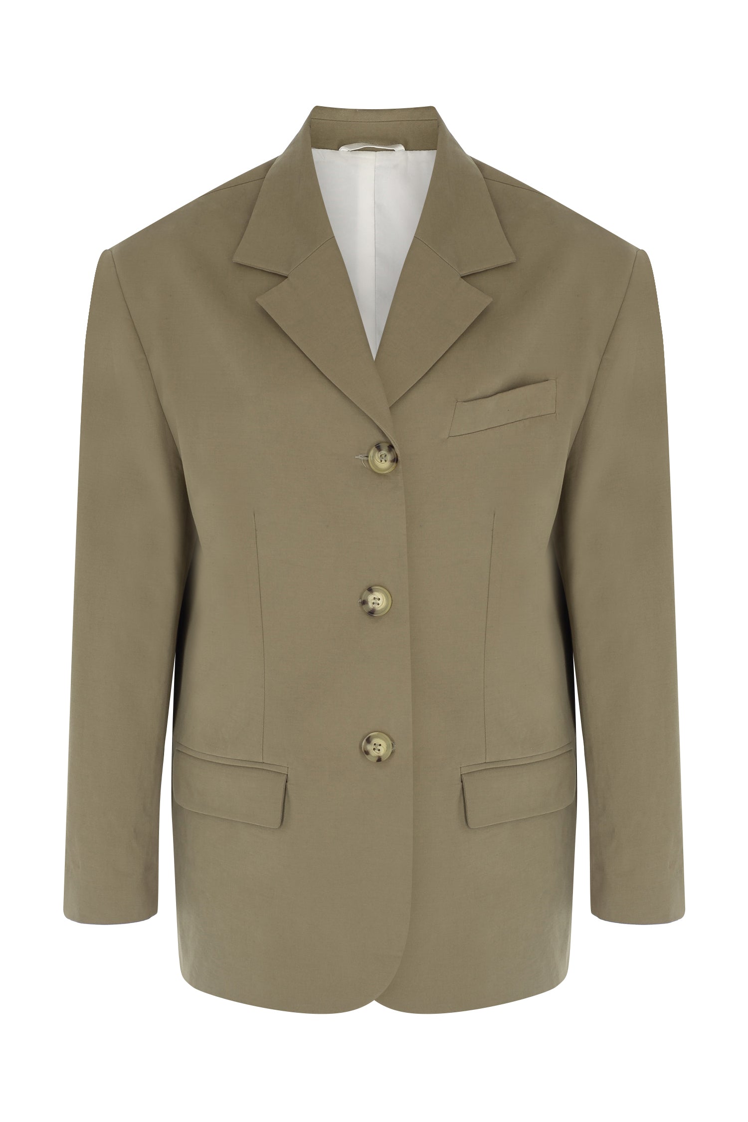 Blazer with three button fastening at the front. It has a wide design. It’s designed for a classic, loose fit and shaped to a straight silhouette with peak lapels, an open front, and welt pockets at the sides.