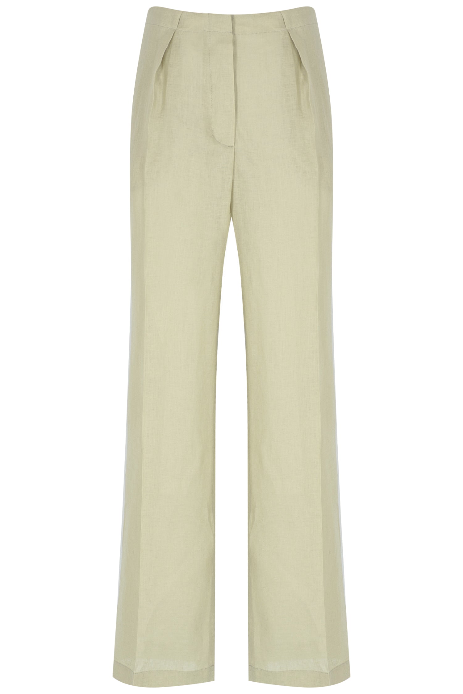 Stylish linen trousers with a relaxed fit and wide hems. Low waisted and thin belted trousers have pleats on the front.