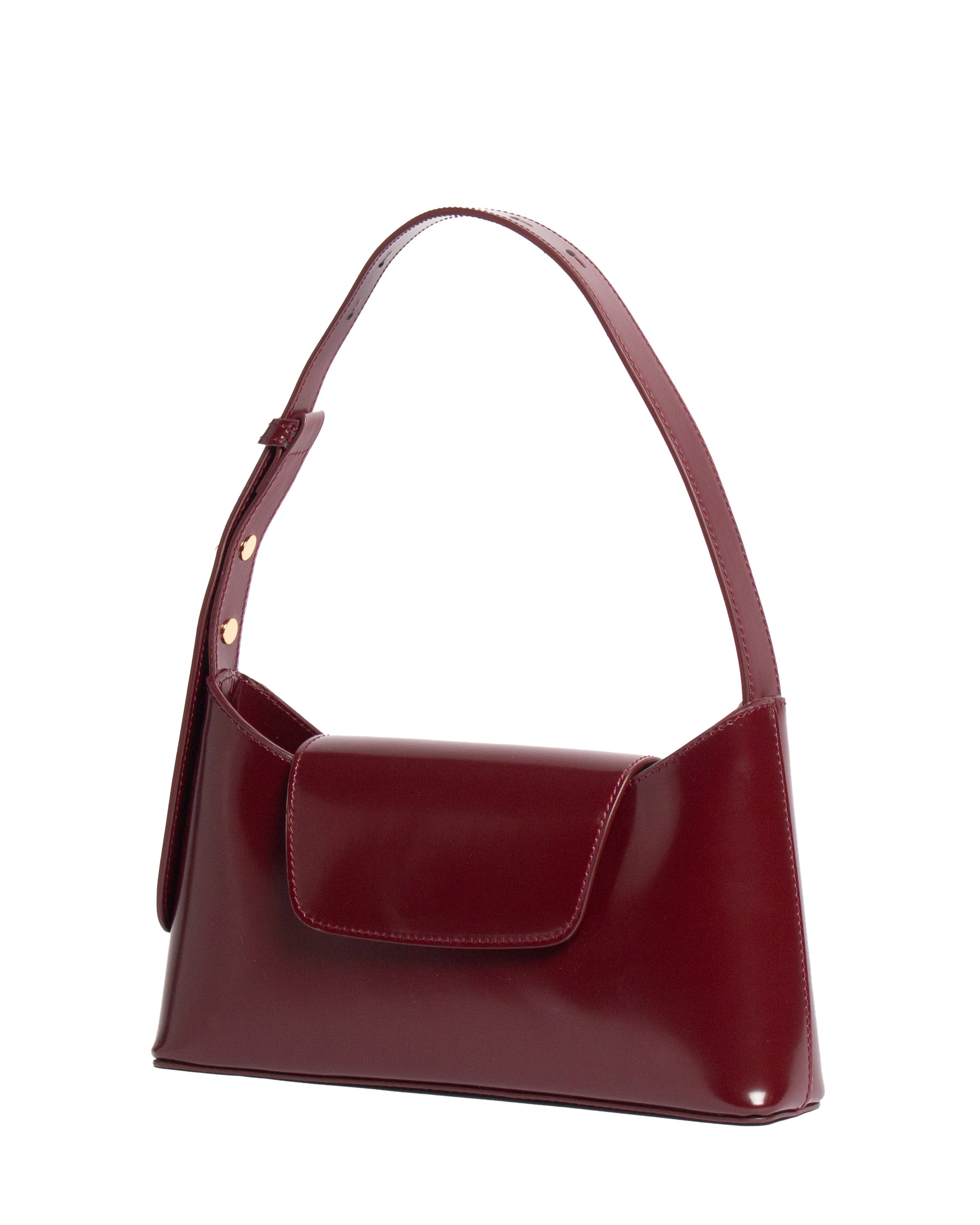 Envelope-shaped shoulder bag with adjustable top handle, magnetic front flap closure, and an internal slip pocket with 18k gold plated hardware.