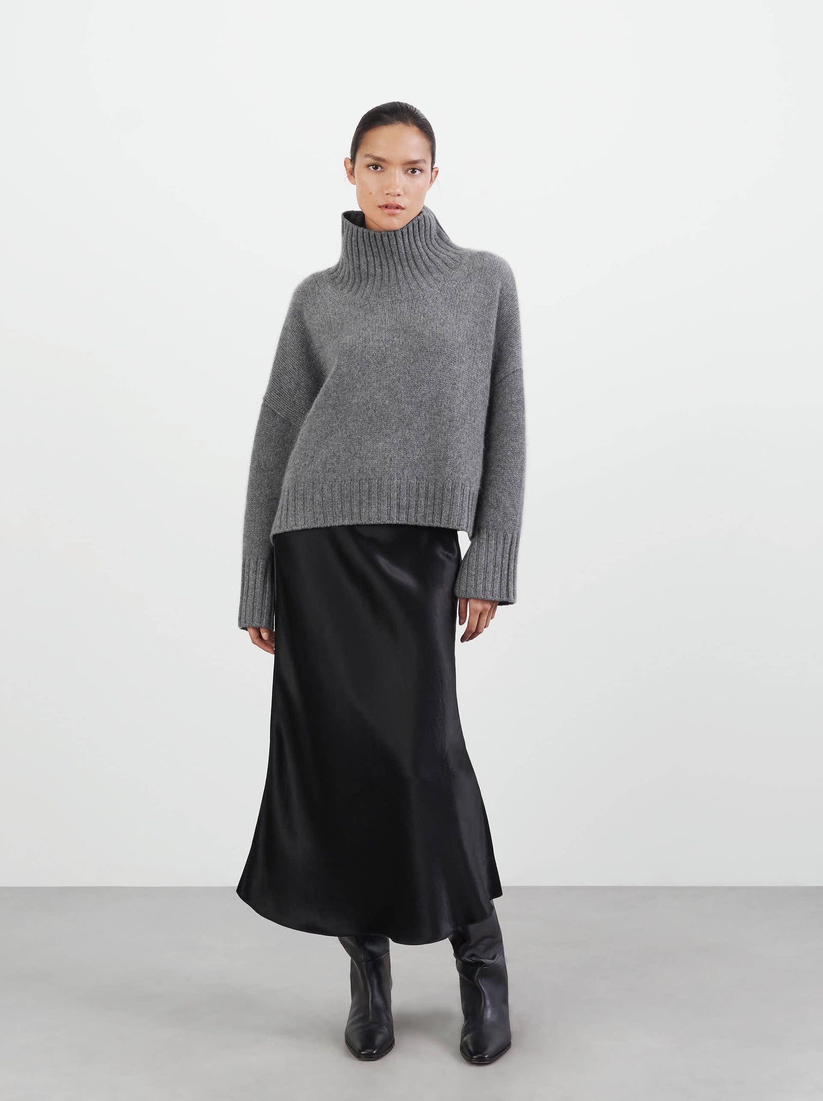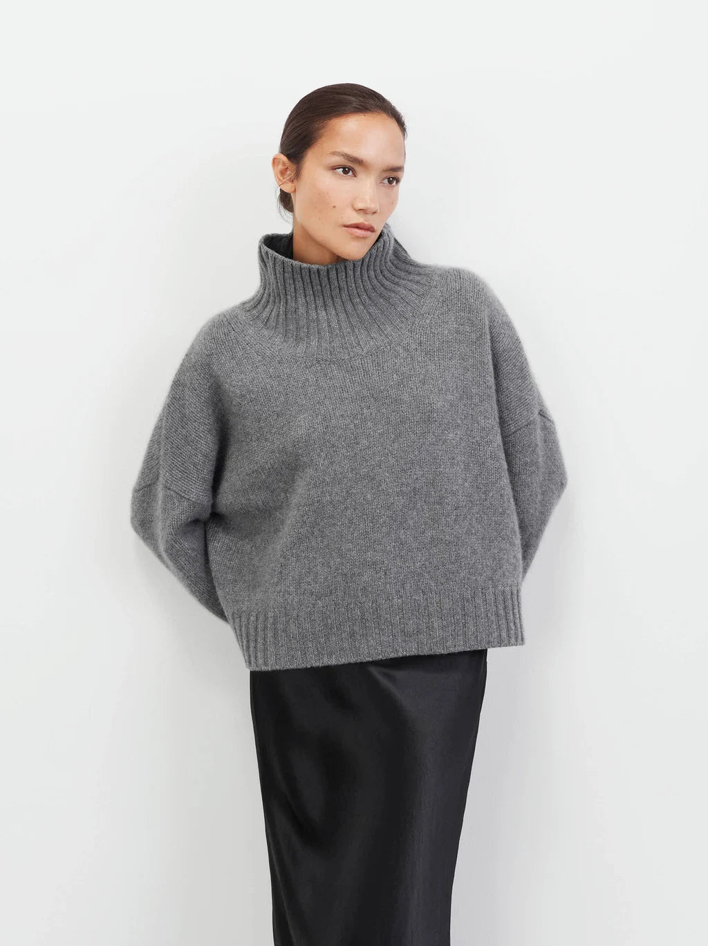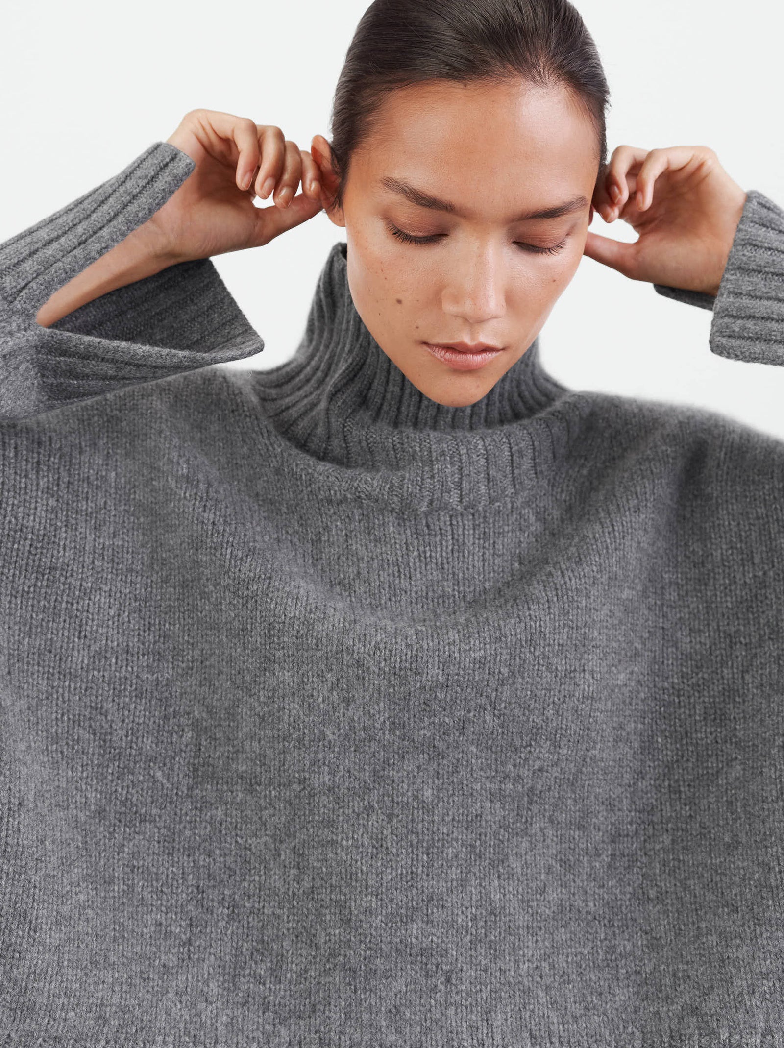 A chunky turtleneck with slits on the sleeves knitted in 100% cashmere.