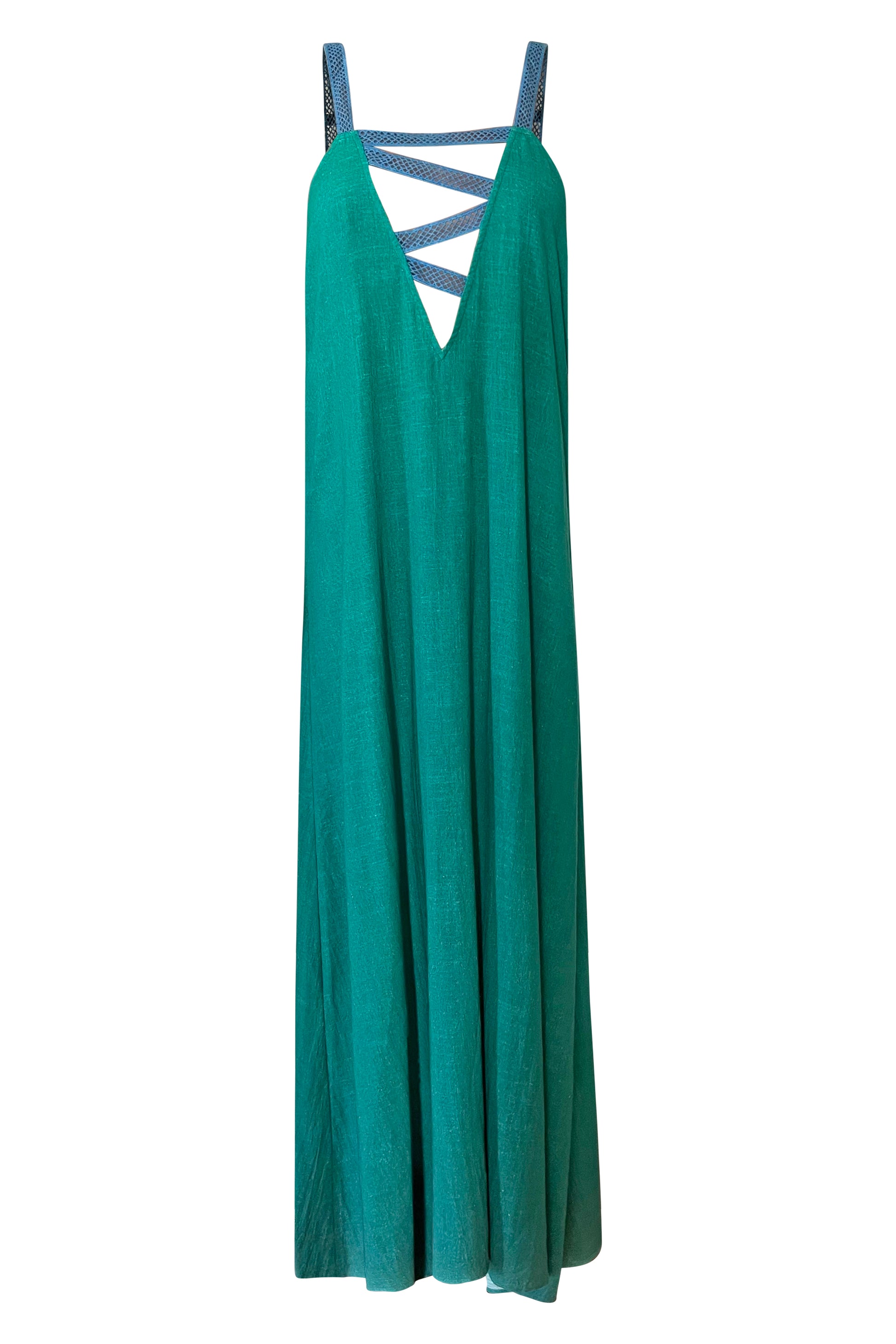 - Tie dye cotton full length dress with a lace criss cross V-neck and a deep V-back.