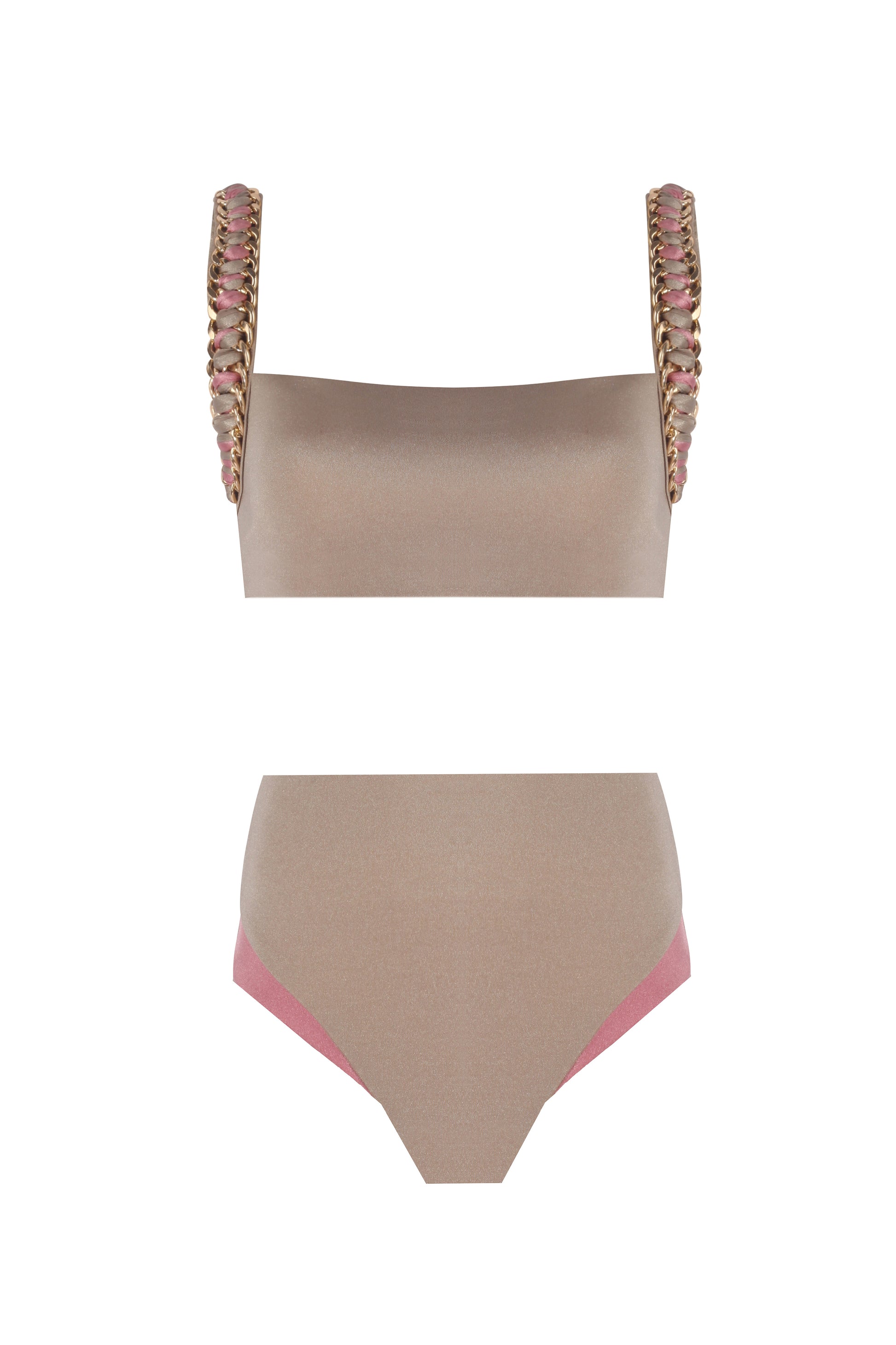 Gold plated chain accessory details on straps, square neck, high waist taupe bikini.