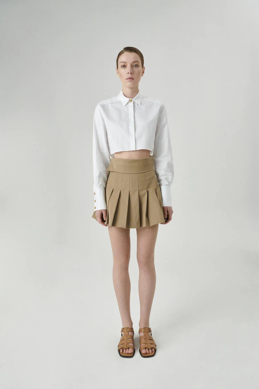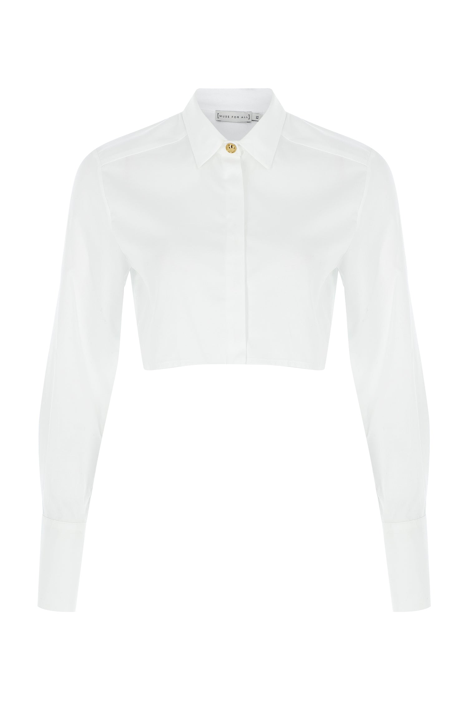 Short cotton shirt that ends below the bust. It has a wide cut and a comfortable stance, as its back has a pleated stamp.