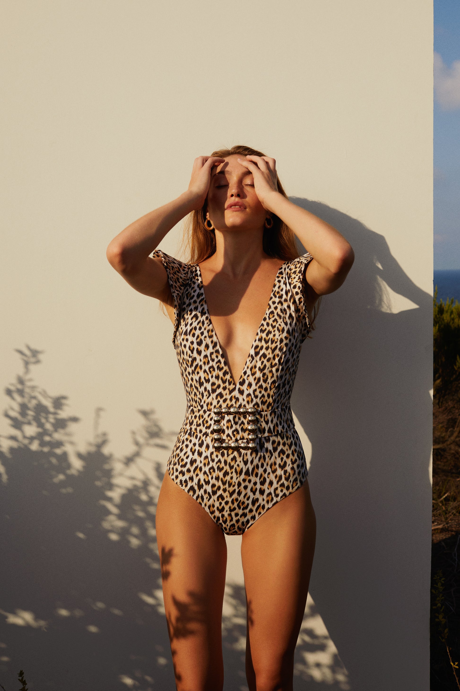 Belt with gold plated buckle, ruffle detailed v neck multicolor leopard print swimsuit.