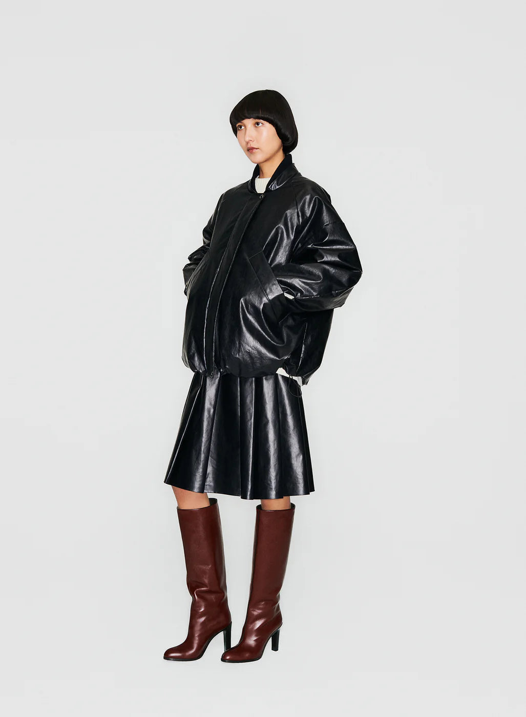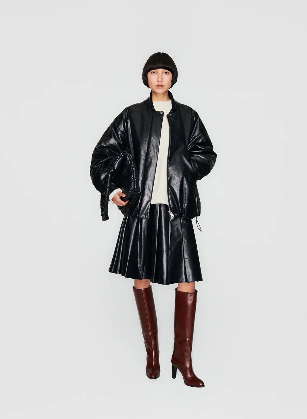 The black Oversized padded bomber is made of the signature oil coated cotton-blend. Its attention to detail includes a double stand collar from oil and a wool-blend rib, front pockets, and adjustable hem. The padded design with an oversized fit makes it the perfect combination of comfort and style during colder days.