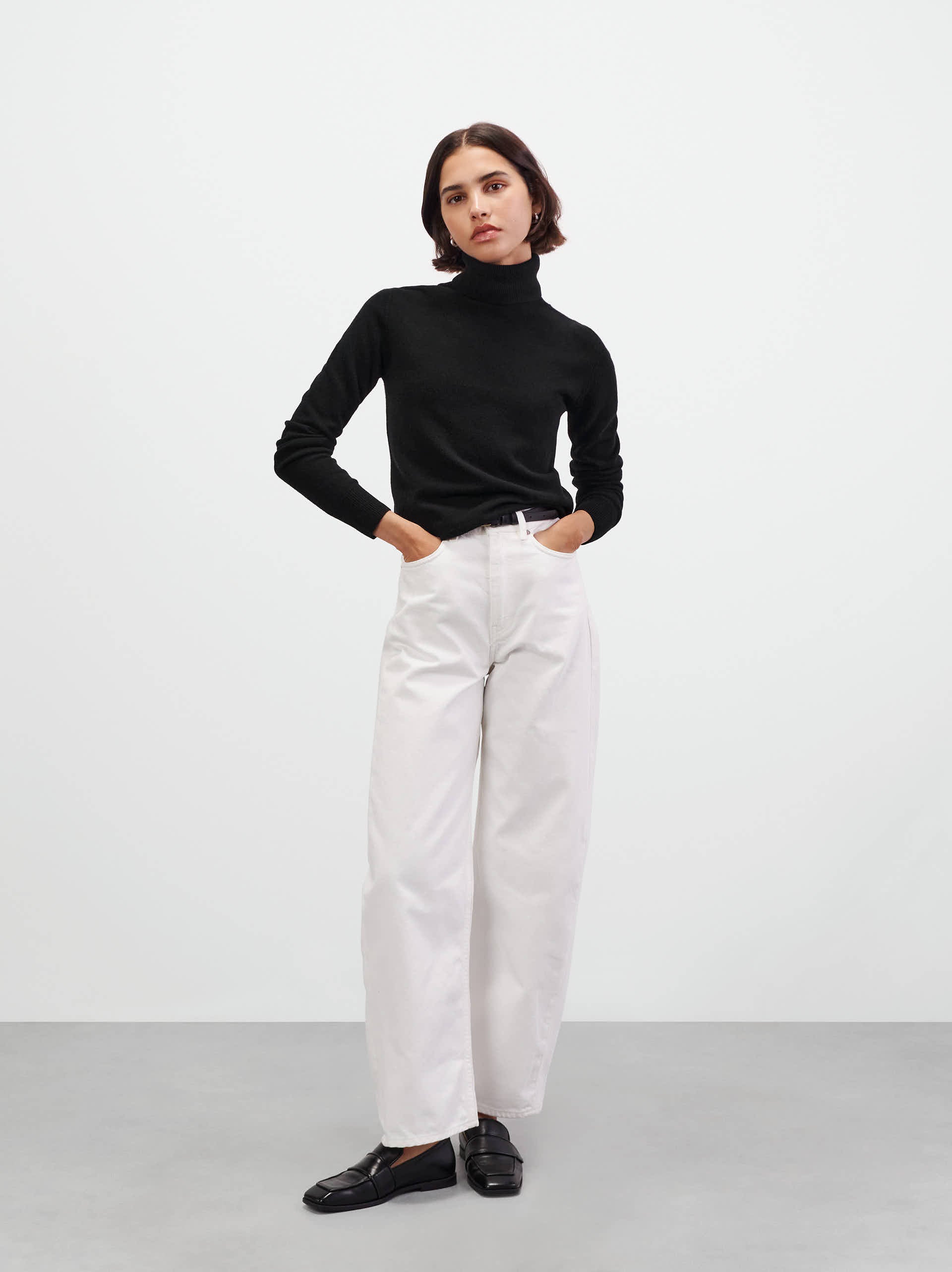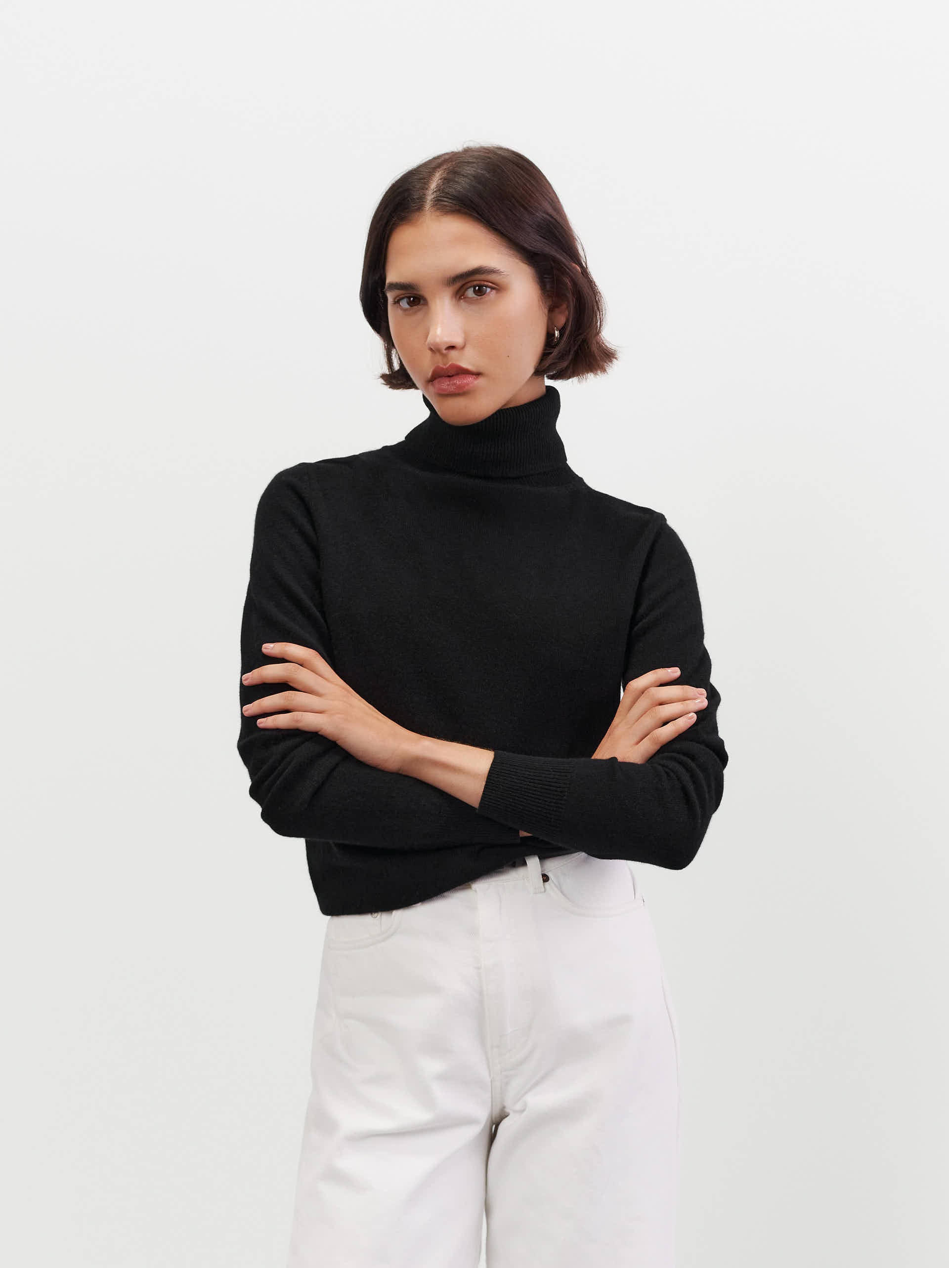 A plain turtleneck knitted in 100% cashmere.