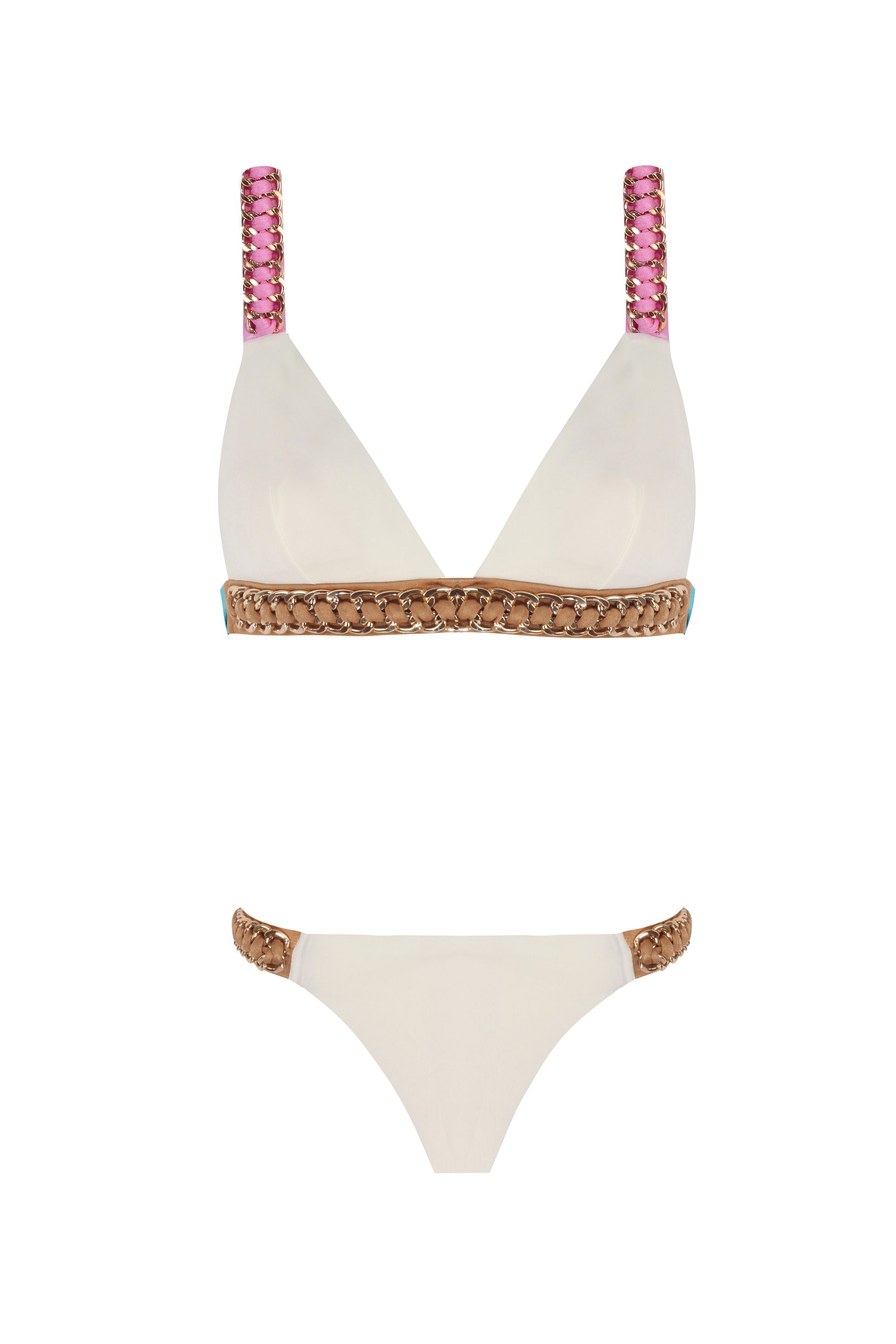 Multicolor trims with gold plated chain accessory, ecru triangle bikini.