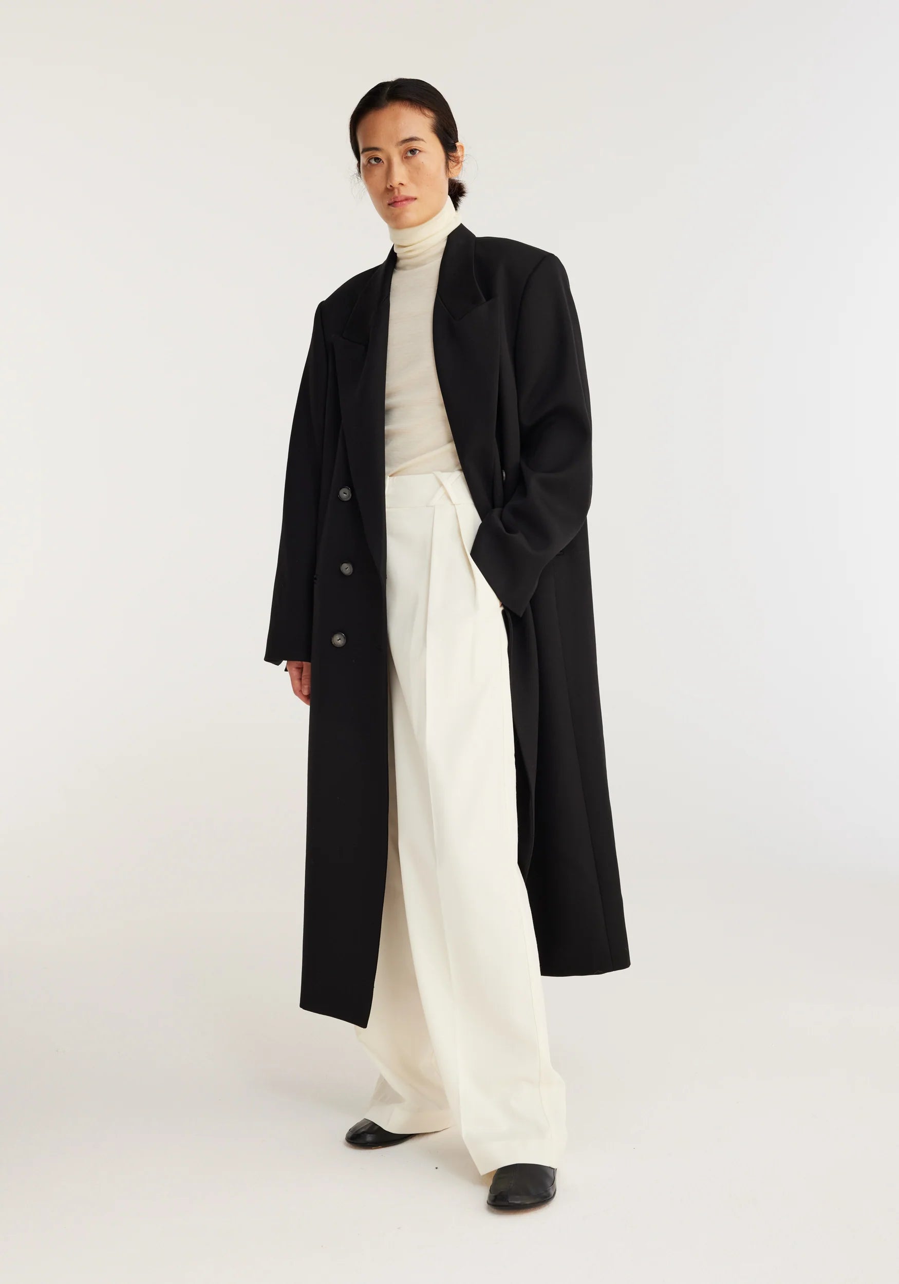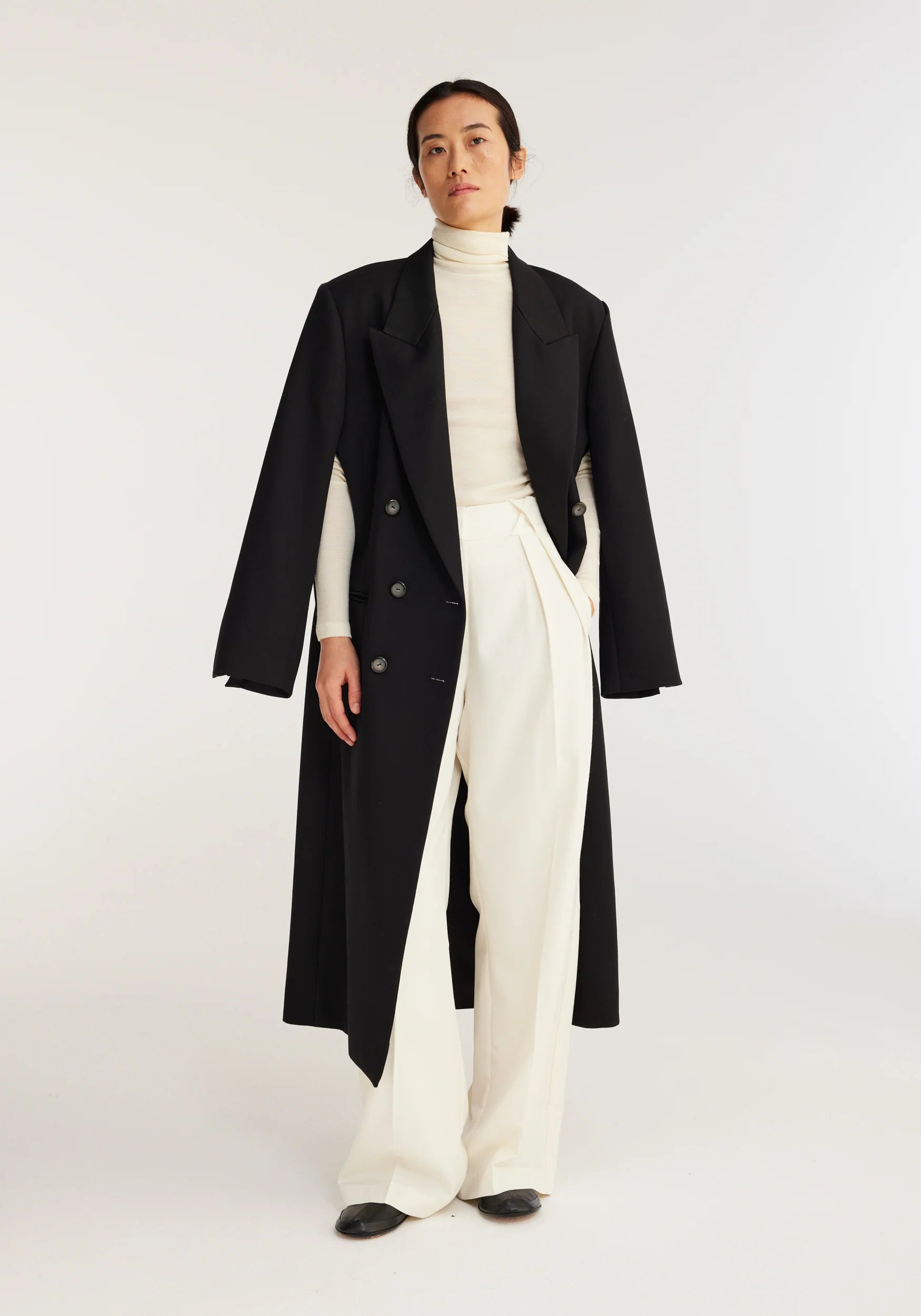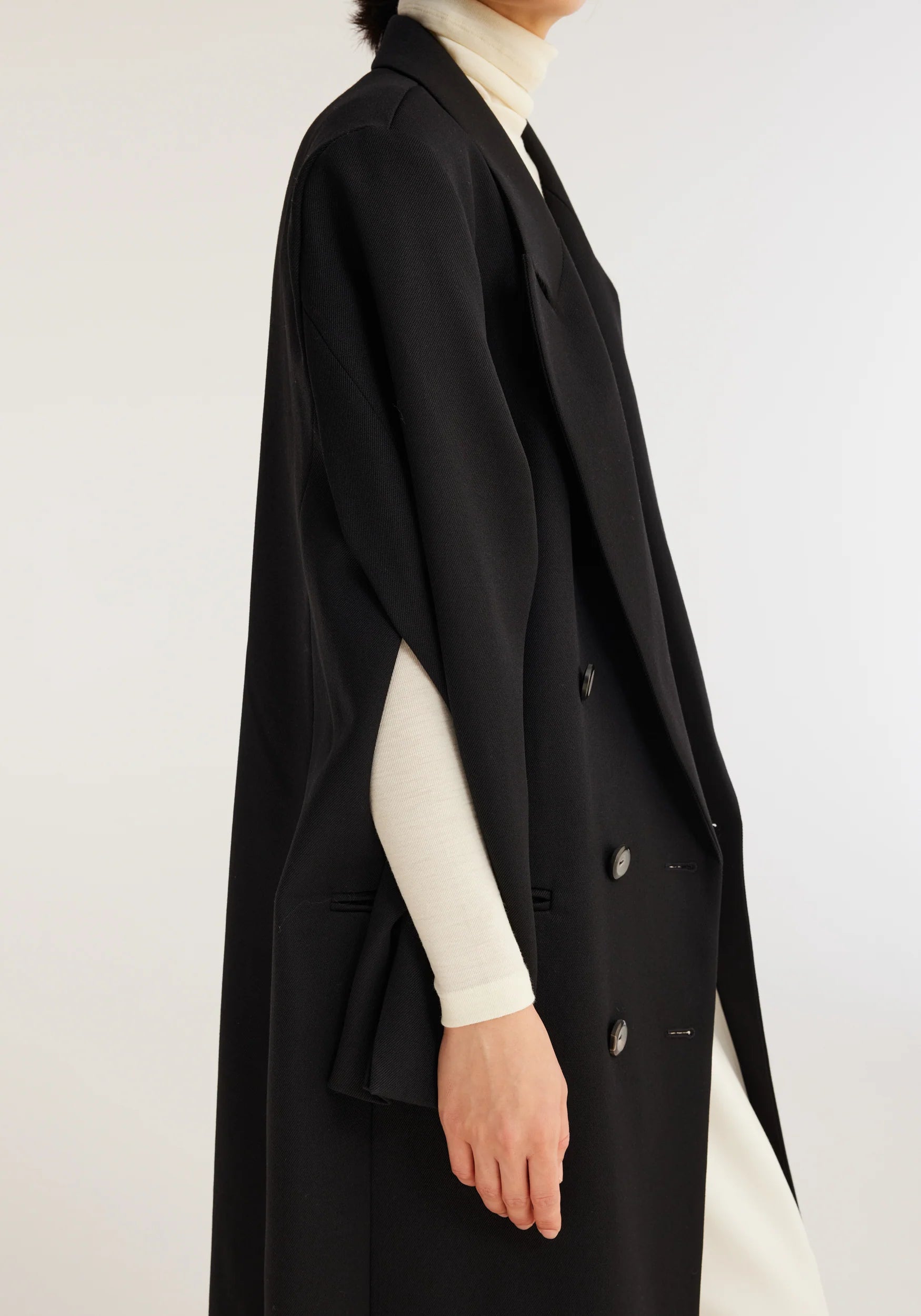 Double-breasted tailored coat with a straight fit and underarm openings, also to be worn as a cape, made in a dense twill. Made from a virgin wool quality by Italian mill Estethia.