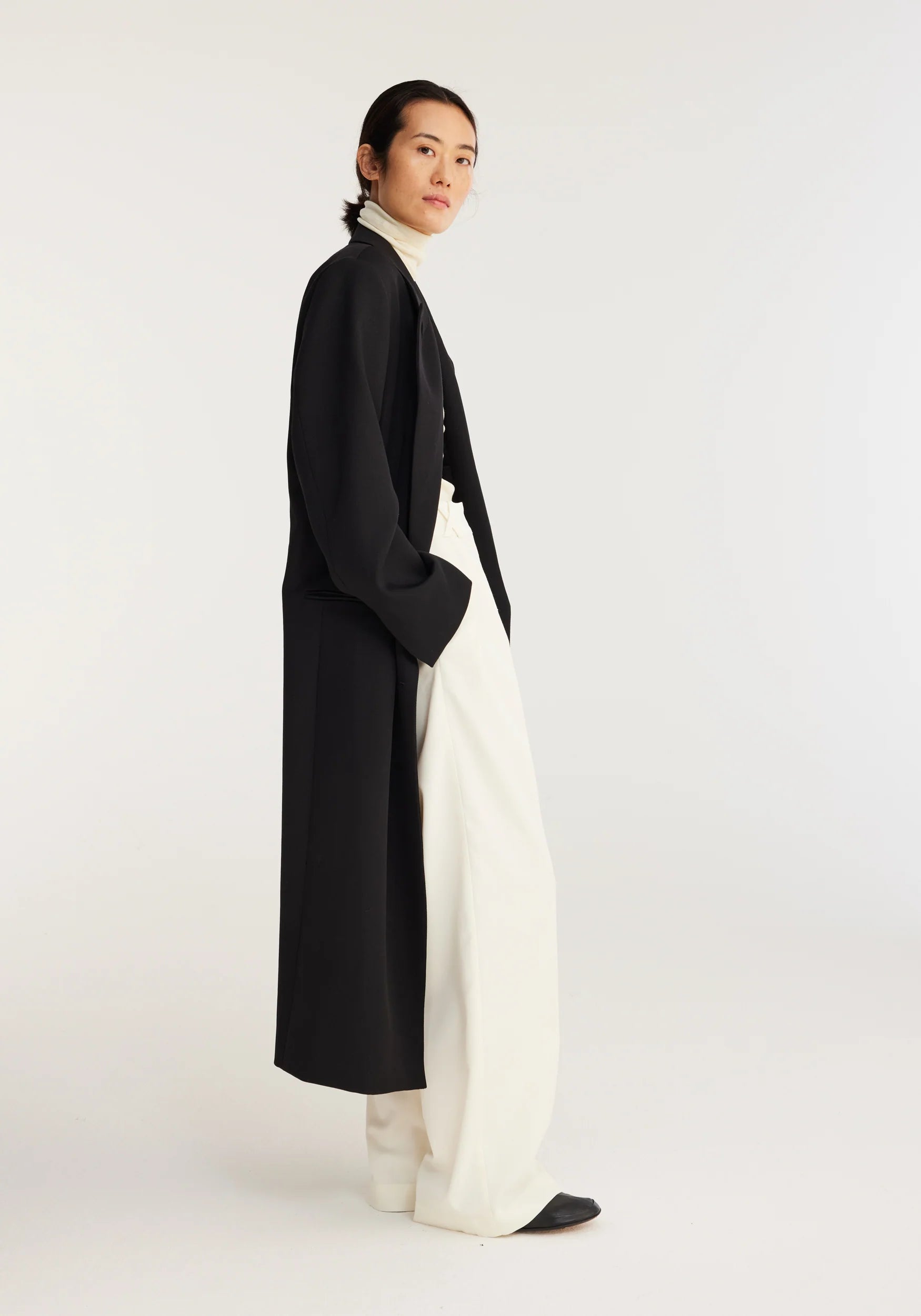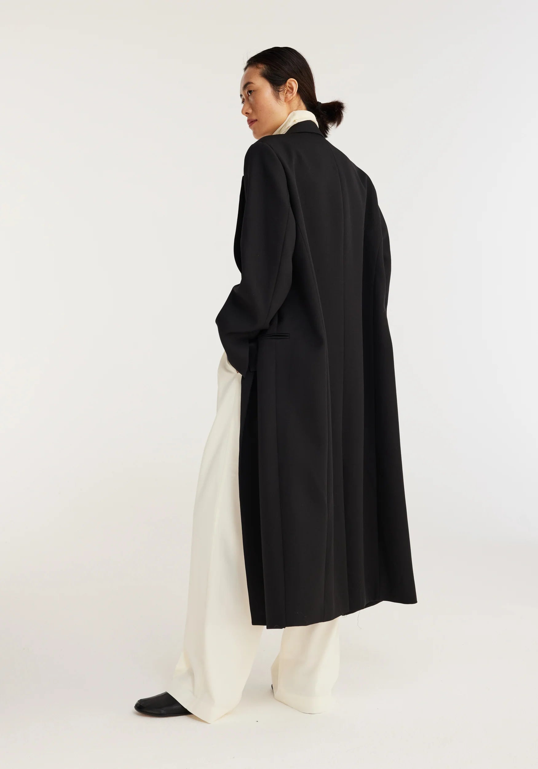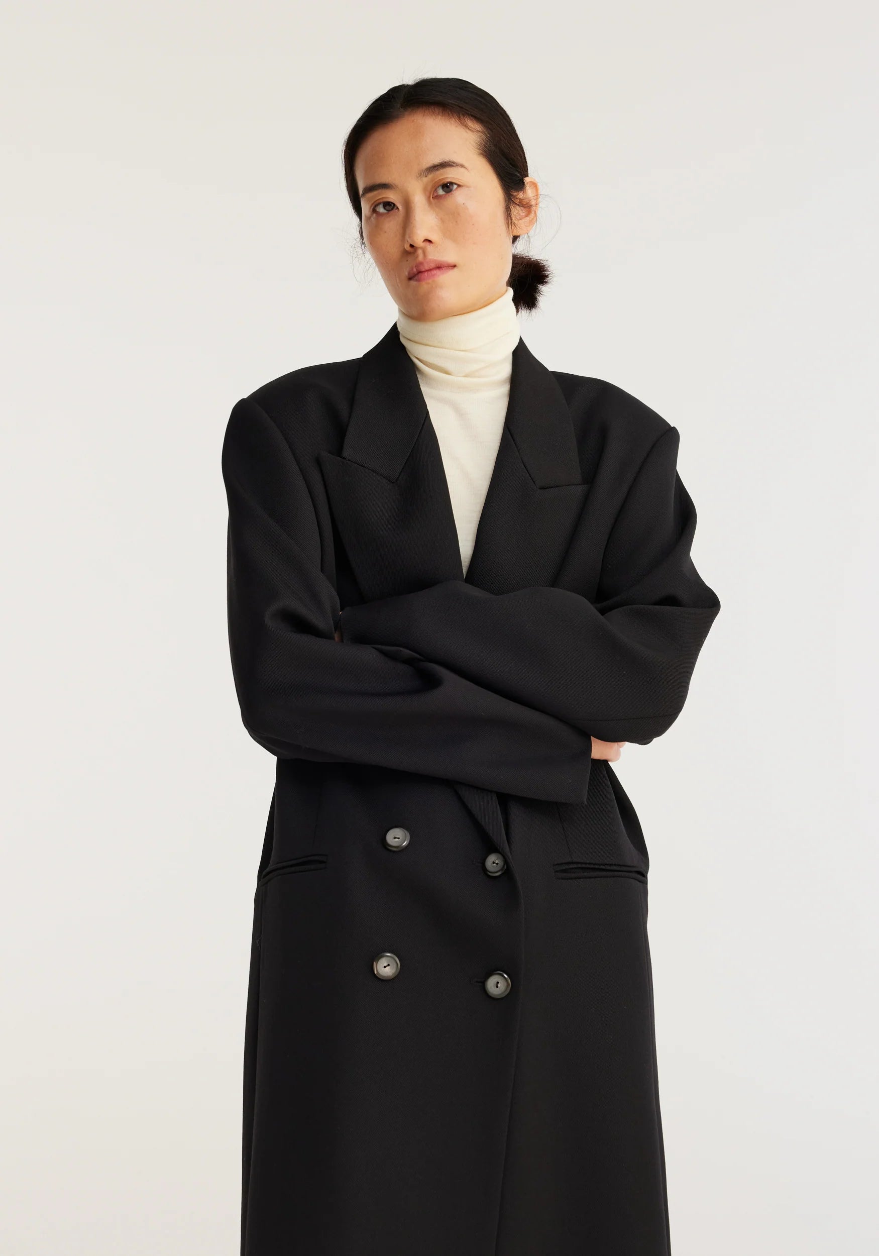 Double-breasted tailored coat with a straight fit and underarm openings, also to be worn as a cape, made in a dense twill. Made from a virgin wool quality by Italian mill Estethia.