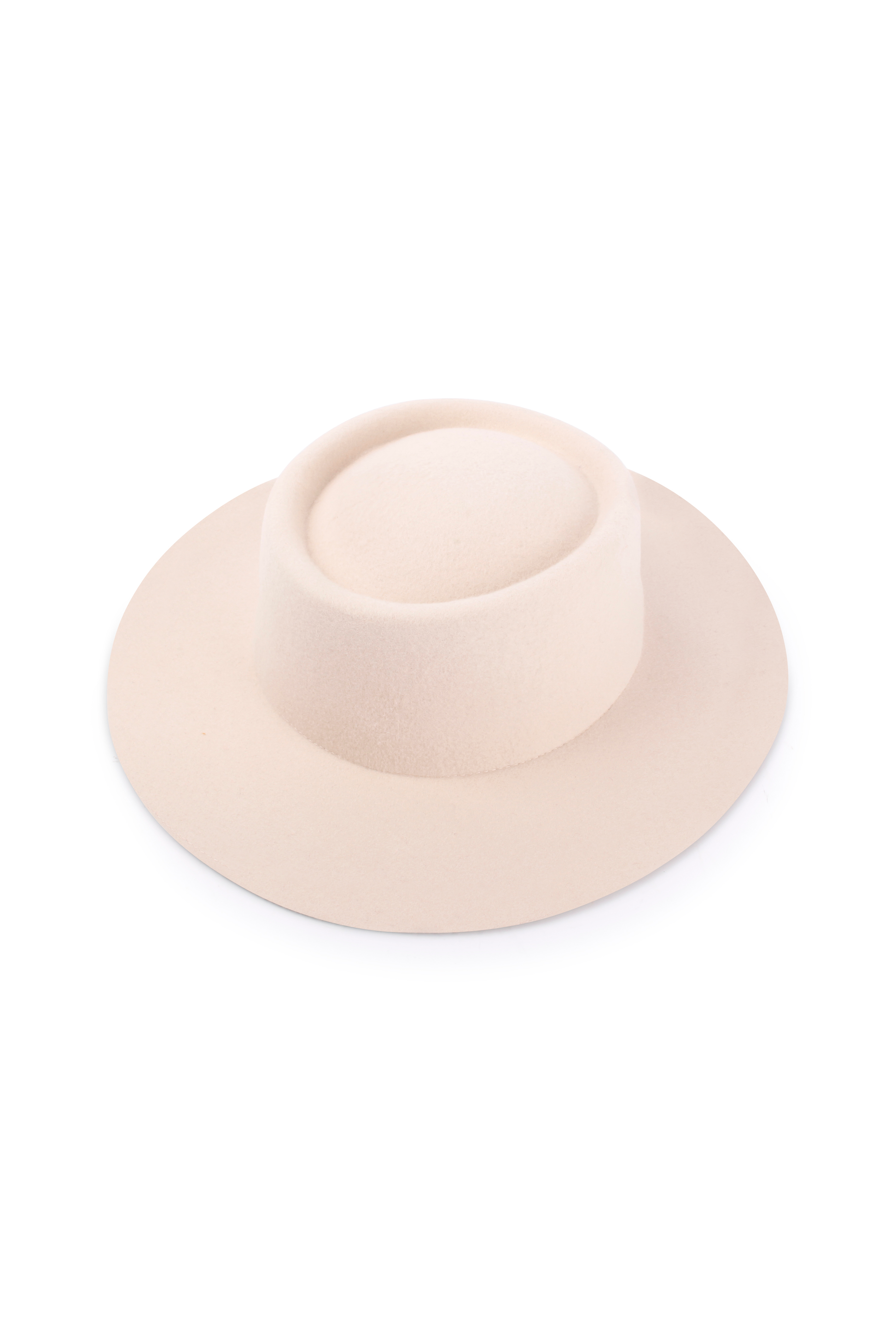 This is our Maron hat. A minimal variant characterised by a round crown and a wide brim.