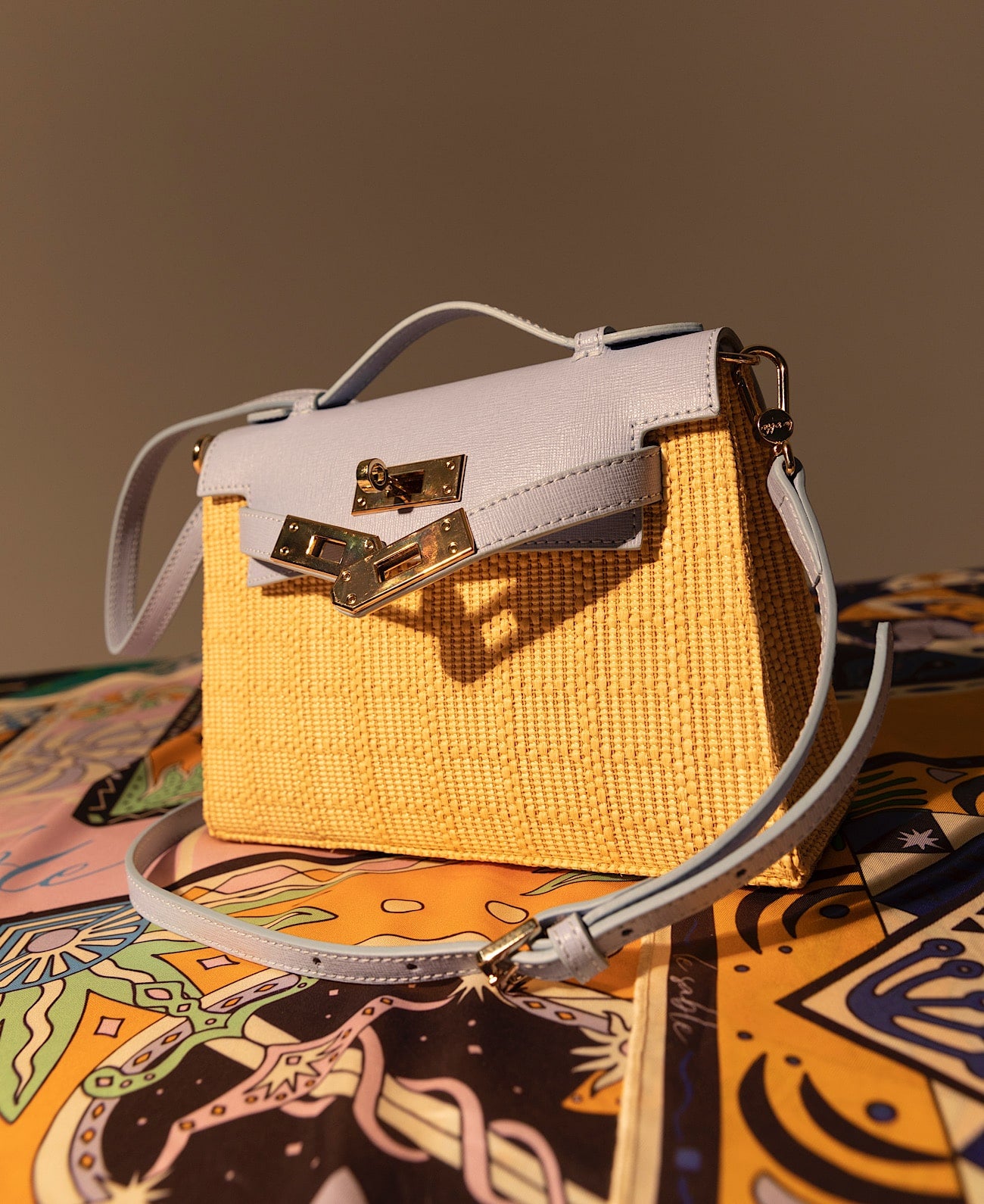 Tóla - is the ultimate style icon. It’s made from our custom made silk straw fabric and leather. Each of the colours has its own significant inside lining. Being 100% handmade, the stitching and details are impeccable. It’s one of the gems throughout our le sable dessert.