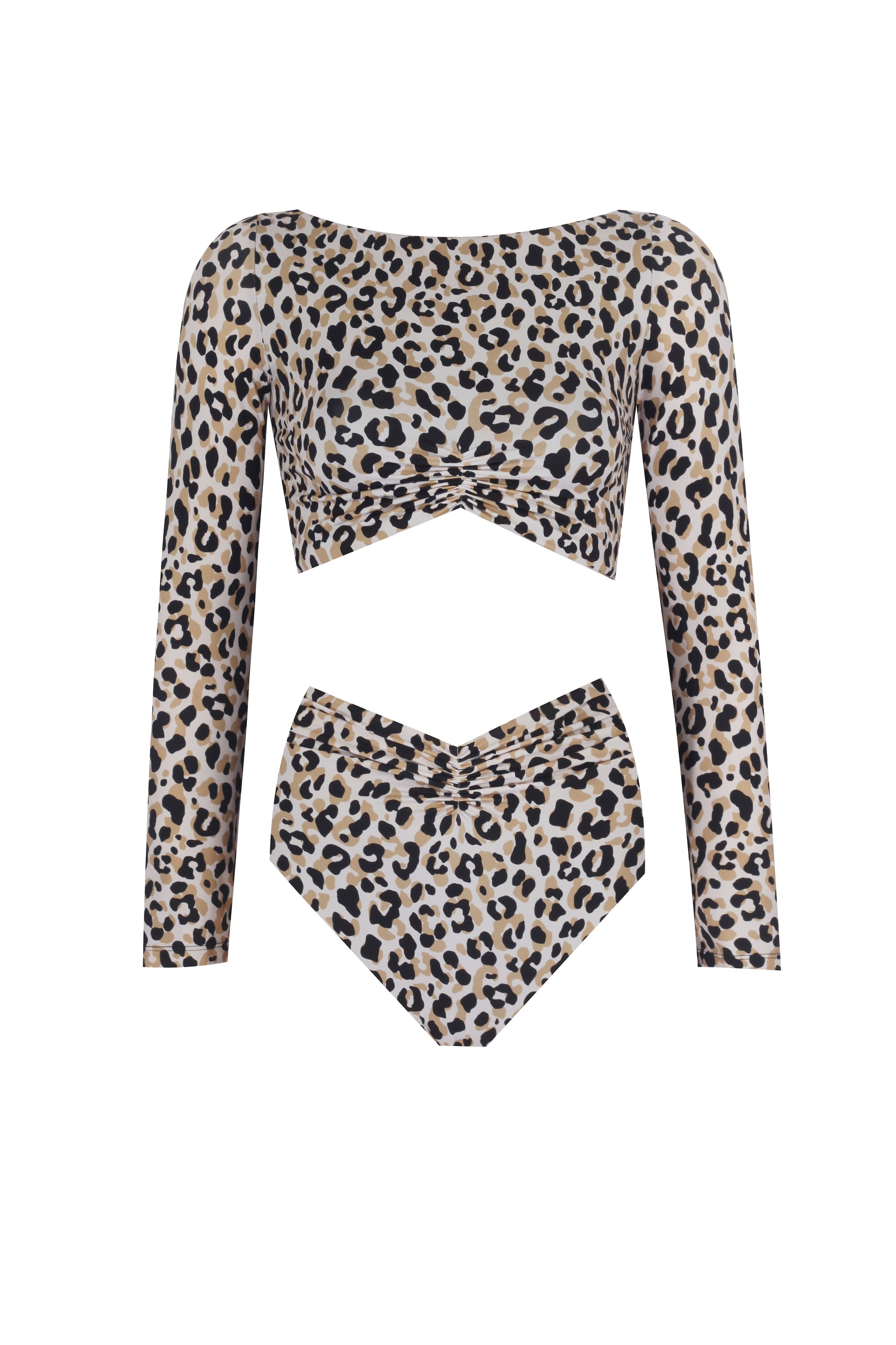 Knot details with gold plated accessory at the back, long sleeve high waist leopard print bikini.